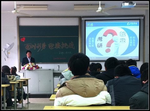 2009级自动化专业在教四306举行了一次“面对形势,迎接挑战”就业考研讲座。本次活动请到了南京华苏科技有限公司副总经理李大龙先生,出席活动的还有2009级自动化专业的班主任程艳云老师。讲座由辅导员叶晓勤老师主持。