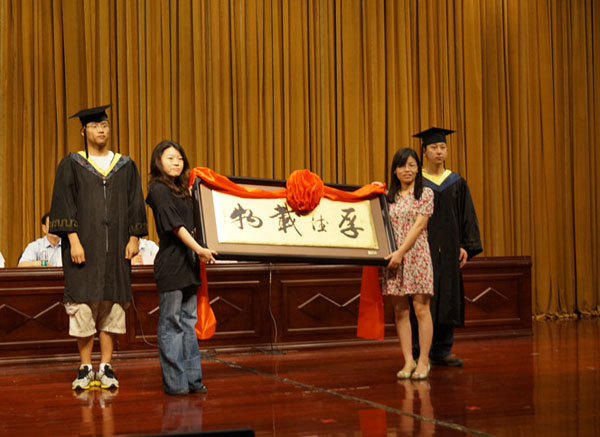 09级毕业生代表张冰同学满怀激情的回忆了在南邮这4年的点点滴滴,他感恩学院老师的谆谆教诲与无私付出,期盼着与同学们十年二十年后的相聚。“感恩母校”道出了全体毕业生的心声,“不忘师恩”是毕业生们的承诺。随后,毕业生代表将一块写着“厚德载物”的匾额赠送给学院,寄托了全体毕业生对学院的深深眷恋和拳拳赤子之心。