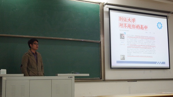 三位学长用风趣幽默的PPT分别就自己的四年大学生活点滴跟2013级的小伙伴们作分享。主要有如何规划大学生活、大学里有哪些可以参与的竞赛以及注意事项、大学里有哪些可以考取的证书以及如何应考、大学里如何端正恋爱观、大学里如何参与社会实践等等与同学们未来发展至关重要的几个方面。