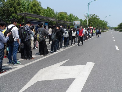 五一放假前夕会有大批学生坐公交出行游玩或回家,站台往往人群拥挤,很容易造成无序和混乱。为了维持秩序保障同学们的安全,由爱心社的志愿者在公交站台通过高举公交车牌来引导等候公交车的同学整齐有序地排成两队,一队是乘坐97路的,另一队是乘坐D1的。活动过程中,爱心社的社员们通过耐心的疏导,保证了乘客们有序排队,文明乘车,现场秩序井然。看到爱心社的志愿者放弃放假回家的机会辛苦维持秩序,绝大部分的同学都自觉响应此次活动,积极配合志愿者们的引导,以此来表示对他们工作的尊重与支持。