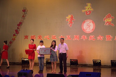 在晚会开始前循环播放的视频里,有爱心社历届主席的肺腑之言,如2012届主席陈宛露为爱心社15岁生日送上的爱语:“择善听而闻,择善语而言,择善人而交,择善行而为”,有来自南中医爱心社、南工院爱心社等校外同盟以及校内兄弟社团的惺惺相惜,更有宿管阿姨、保安叔叔等的亲切问候,并有众多方言版“祝爱心社生日快乐”。爱意融融的祝福语配上红白相间的爱心气球,场面格外温馨美好。晚会还穿插了爱心社精心制作的另外两个视频,“回望过去”和“风采展示”,分别展现爱心社15年的发展历程和爱心社的特色品牌活动。十五年风雨兼程,十五年爱心相伴,爱心社陆续举办各色爱心活动,如“义工体验月”、“文明乘车,安全出行”、“军服回收”、“手语推广”、“陌上花”爱心联合研讨会等,使爱心公益这条路更宽、更广。