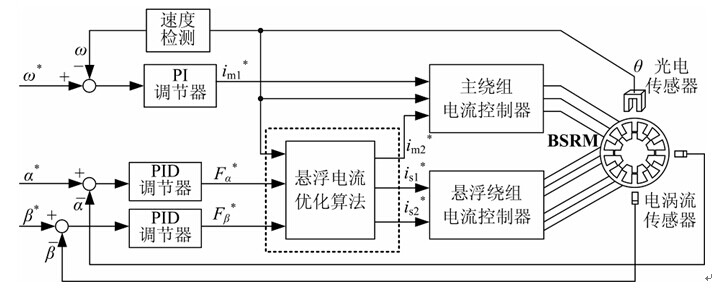 无轴承开关磁阻电机转矩和悬浮力间存在复杂耦合关系,且很难在控制策略和数学模型中实现二者的完全解耦,是制约无轴承开关磁阻电机悬浮和运行性能难以提高的重要因素。针对上述技术问题,提出了一种无轴承开关磁阻电机及其控制方法。在优化设计12/8极双绕组无轴承开关磁阻电机定子、转子间极弧关系的基础上,提出了该电机的一种控制方法。该控制方法解决了悬浮力和转矩的解耦问题,简单有效,并且使绕组的铜耗最小。