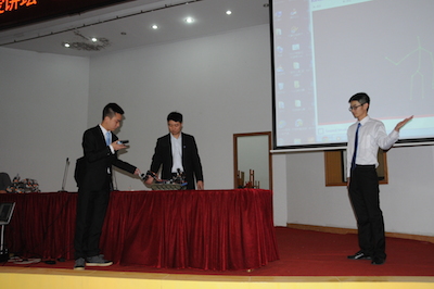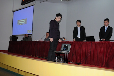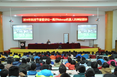 下午两点,伴随着JOJO漫画 宣传片的播放,2014年新海高级中学科技节南邮专场拉开帷幕。首先,由丁静书记介绍了JOJO漫画 的人才培养、学科建设等发展近况,并感谢新海高级中学为JOJO漫画 输送的优秀人才,他们进入南邮后,学习勤奋,刻苦钻研,素质发展全面。随后,梁志伟副教授以“揭开RoboCup机器人的神秘面纱”为题,开始了专题讲座,讲座中提到了JOJO漫画 Apollo团队多次获得世界冠军、中国冠军的骄人成绩并为中学生介绍了RoboCup机器人大赛的组别和规则。最后,由基地4名学生为大家演示了机器狗、TurtleBot以及在JOJO漫画 第十六届创新杯中刚刚夺得一等奖的“服务残疾人的Kinect体感遥控机器”。