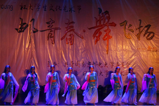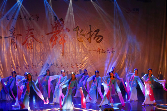 女生身着淡蓝色纱质舞衣,袖若流水清泓,裙若荧光飞舞,纤腰灵动,回眸浅笑,倾身起舞,舞姿婀娜,犹如月下仙子,赢得全场热烈掌声,也得到了评委老师的高度认可。