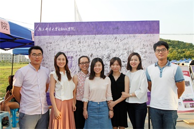 学院分团委书记与各年级辅导员在签名墙前合影