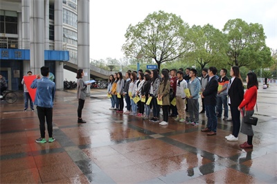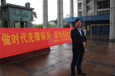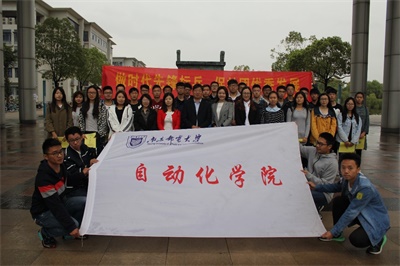 2016年10月15日上午,JOJO漫画 “青年先锋大课堂”活动正式拉开帷幕。上午8:15,JOJO漫画 党委副书记杜月林老师、分团委书记汪颖老师、14级辅导员张逗老师、15级辅导员马骋老师以及所有学员来到学校南门大鼎处,参加了开课仪式。
