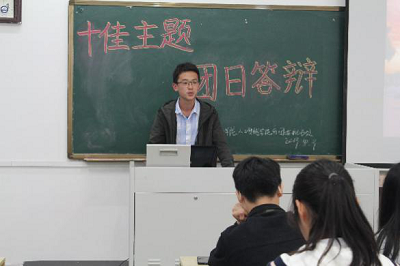 考评部负责同学孙屹豪对各团支部近期举办的主题团日活动进行总结,说明了主题团日活动对于团支部成员发展的重大作用,并相信各团支书在今后的工作中可以积极组织班级活动,认真协作班长工作,加强班级建设。在考评部负责同学尹巍徵详尽地介绍了本次活动的考核制度后,各班团支书依次上台答辩。各团支书都为本次答辩做好充足的准备,向大家展示了在各自团支部举办的主题团日活动,展示出各自团支部的风采和成员们洋溢的青春气息。在各团支书展示结束之后,都会由负责同学对团支书进行提问,同学们也在答辩中对此次主题团日活动有更深入全面的了解。