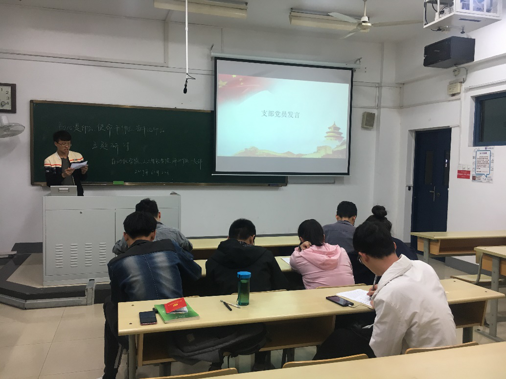随后,支部党员们一起进行了主题研讨,每位党员都上台进行了发言,讲述了自己作为一名党员是如何看待初心、使命和奋斗。同学们一致认为初心使命是前进的导向,持续不断地奋斗是前进的动力,中华民族伟大复兴需要时代新人的不断努力才能够实现。