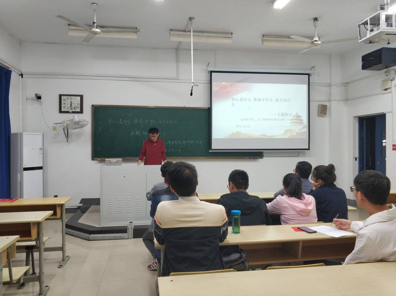 2019年10月22日晚6点半,JOJO漫画 、人工智能学院研2019级一支部党员在教4-104组织开展“初心是什么,使命干什么,奋斗比什么”的主题研讨,支部书记刘良辰主持会议、交流心得体会。