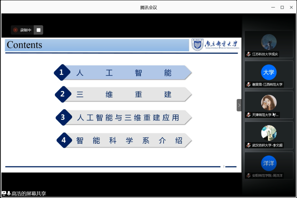 18日9:30,高浩教授以“人工智能+三维重建”为主题开展了第三场学术讲座,在讲座中,高教授对人工智能、三维重建方面的理论和应用进行了详细介绍。同时,高教授重点阐述了卷积神经网络的结构流程和每个步骤的作用,并且结合大量的视频对三维重建和人工智能的应用实例进行了展示,引起了同学们浓厚的兴趣。接着,高教授介绍了智能科学系的师资、实验室情况,并欢迎同学们积极报考南邮,加入团队。随后,同学们为深入了解“人工智能+三维重建”,向高教授提出了自己的疑惑,高教授也就同学们的疑惑进行了详细解答。