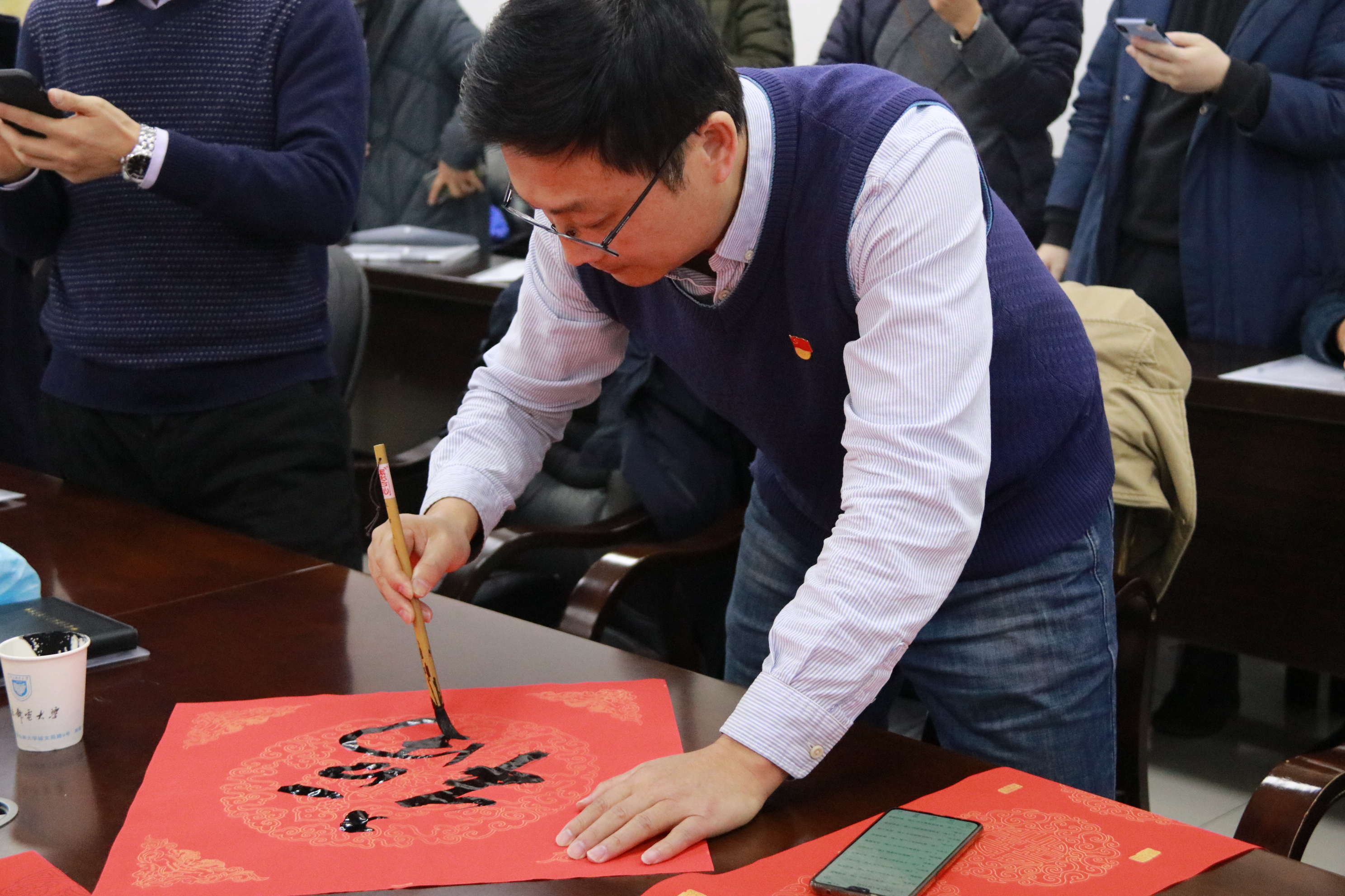 恰逢学院召开第二届教职工代表大会暨工会会员代表大会第三次会议,学院党委书记张翼现场挥毫,为教职工书写春联、福字,苍劲老道的行草映衬在洒金红宣纸上显得赏心悦目。本次活动所有春联、福字,均由陈迪生副书记代表工会,分发给学院教职工。