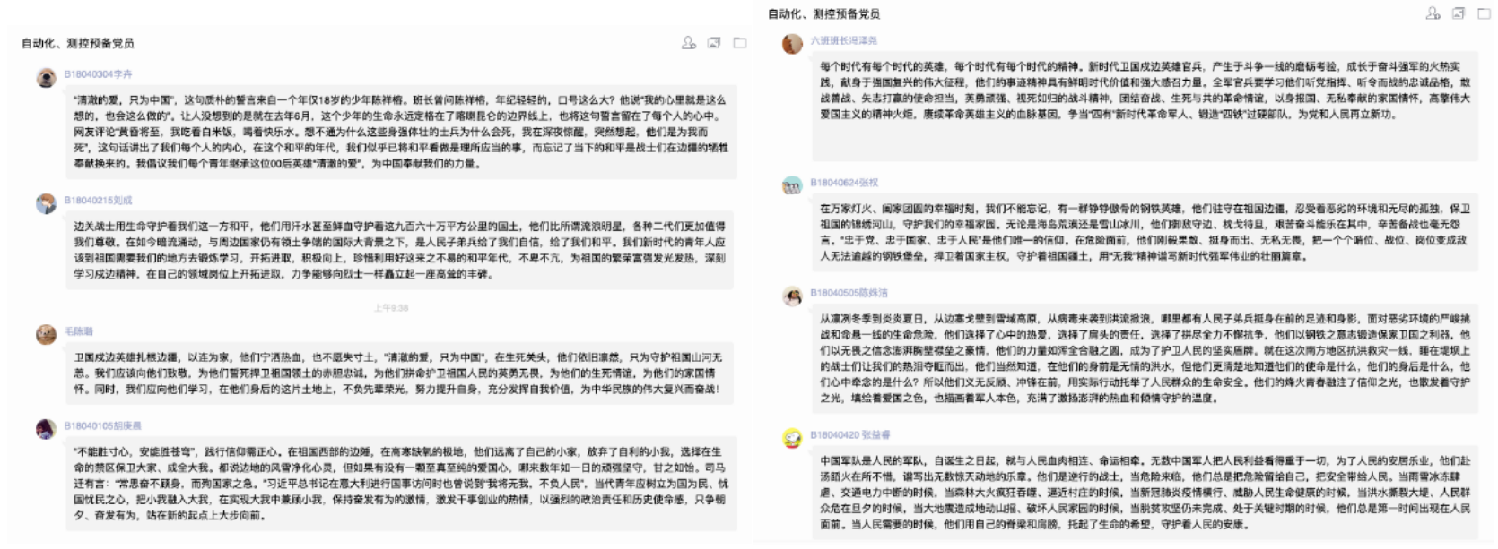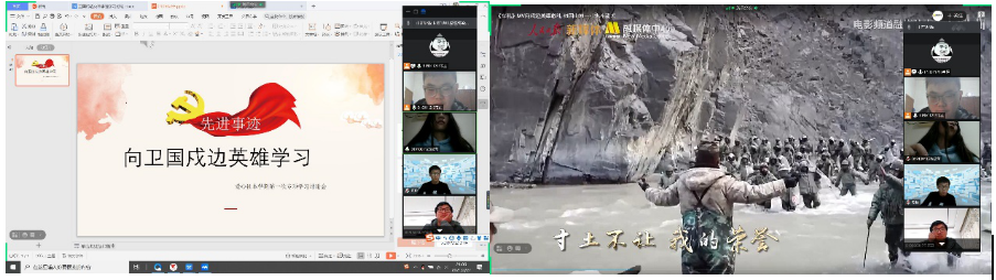 2018级团支部,以预备党员、入党积极分子为表率,积极组织发动广大团员,学习观看卫国戍边英雄事迹,谈体会,写感悟,利用线上平台广泛开展讨论交流。