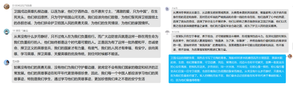 “清澈的爱,只为中国。”在祖国的边疆,英雄官兵用铮铮誓言和实际行动诠释着对祖国最纯洁的爱。家为人民不怕牺牲、勇于奉献的精神,学习他们的责任与担当,把个人与祖国相联系,把个人梦想融入国家的复兴之梦。2020级各支部,积极组织广大团员学习观看戍边英雄事迹,谈体会、写感悟,在线上平台积极展开讨论交流。“祖国的边疆有一群可爱的人在时刻用生命保护我们,作为当代大学生,我要学好知识、努力奋斗,致敬中国这些边防战士,他们是最可爱的人。”B200408班夏雨轩说。