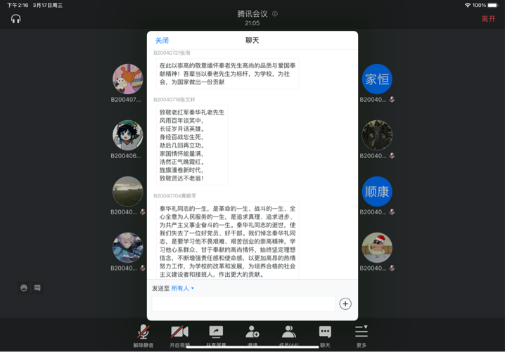 JOJO漫画 2020级各团支部也于3月17日开展秦老事迹线上讨论会,旨在缅怀秦老,勉励南邮青年继往开来。讨论会介绍了与秦老相关的南邮发展历程以及秦华礼老先生的红色事迹,让同学们深入了解了秦老为南邮做出的巨大贡献,并深刻领会了秦老的精神。在“我想对秦老说”环节中,大家积极讨论,踊跃发言,道出自己的心声,以文字的形式表达内心深处对秦老的钦慕和怀念,表明自己要不断拼搏进取、开创未来的坚定信念。