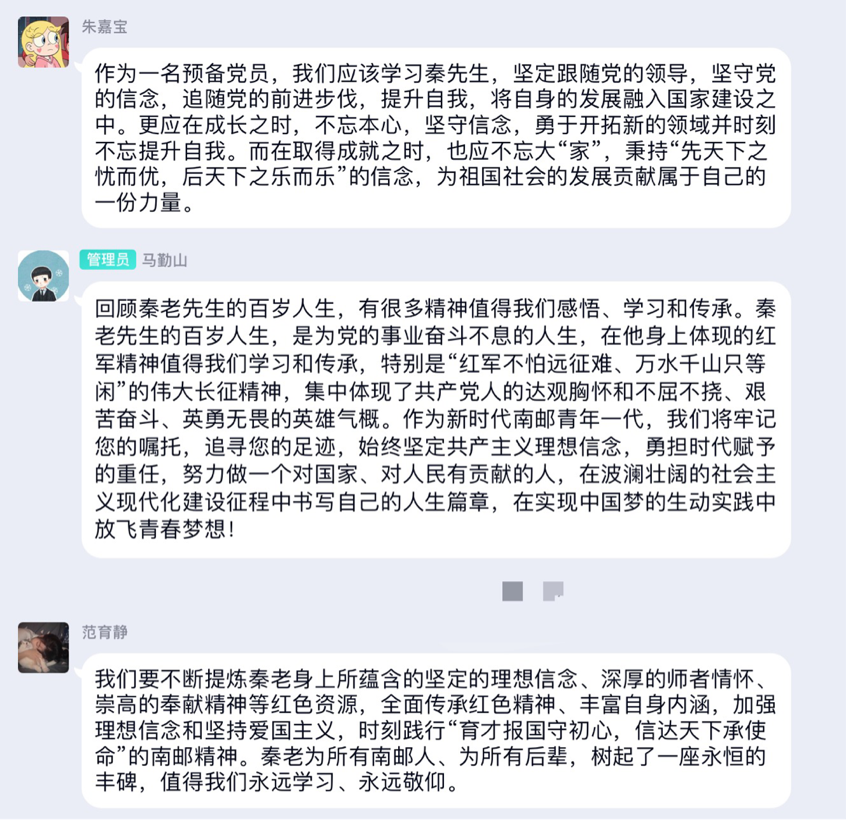 2021年,正逢党的百年华诞,此刻,我们即将迎来79周年校庆,JOJO漫画 2019级自动化专业全体成员以学习南邮的红色校史文化为主题,结合秦老先生的宝贵品质,分享了自己的学习心得和感悟。有同学说到,秦老在退休之后也并没有切断与南邮的联系,在讲台上践行着身为党员和人师的奉献精神,永远跟党走,坚决不掉队,于弥留之际还将工资卡的余额作为最后一次党费上交给党,老先生的无私值得我们每个同学深入思考,为之感怀。