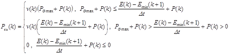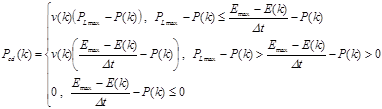 式中:P(k)为第k个时段的运行功率;PGmax+P(k)为功率边界的影响;E(k)–Emin(k+1)为第k个时段内的最大可放电量,(E(k)–Emin(k+1))/∆t+P(k)则为考虑当前工况下EV的可放电量潜力,反映出电量边界的影响。 上述表达式旨在通过比较功率边界与电量边界,计算出各时段EV的上、下备用容量。