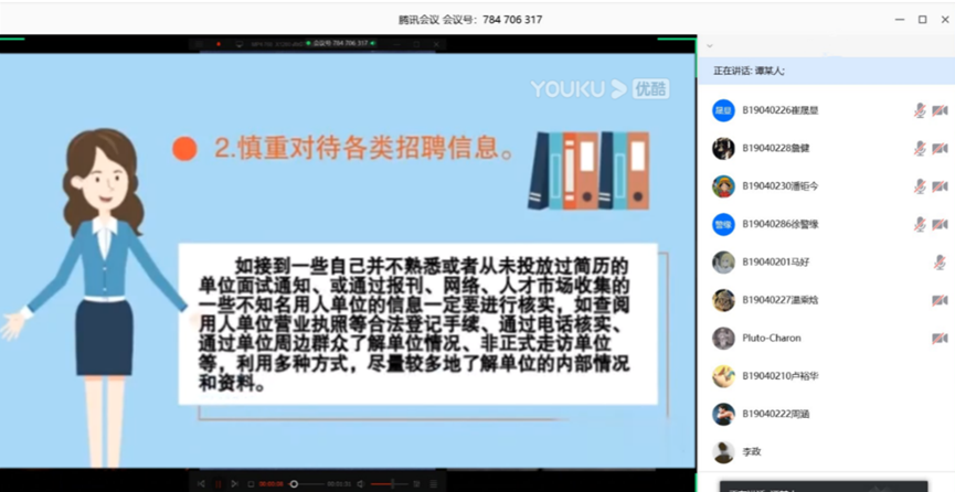 近年来,随着通讯技术的发展及多样化,电信诈骗手段和形式也开始呈现出多样化趋势,许多在校大学生由于缺乏相关知识而跌入陷阱、蒙受损失。针对最近日益猖獗的网络诈骗,B190405、B190406团支部积极响应学校和组织号召,精心地策划并开展了此次班会活动,帮助同学防患于未然,远离各色骗子。