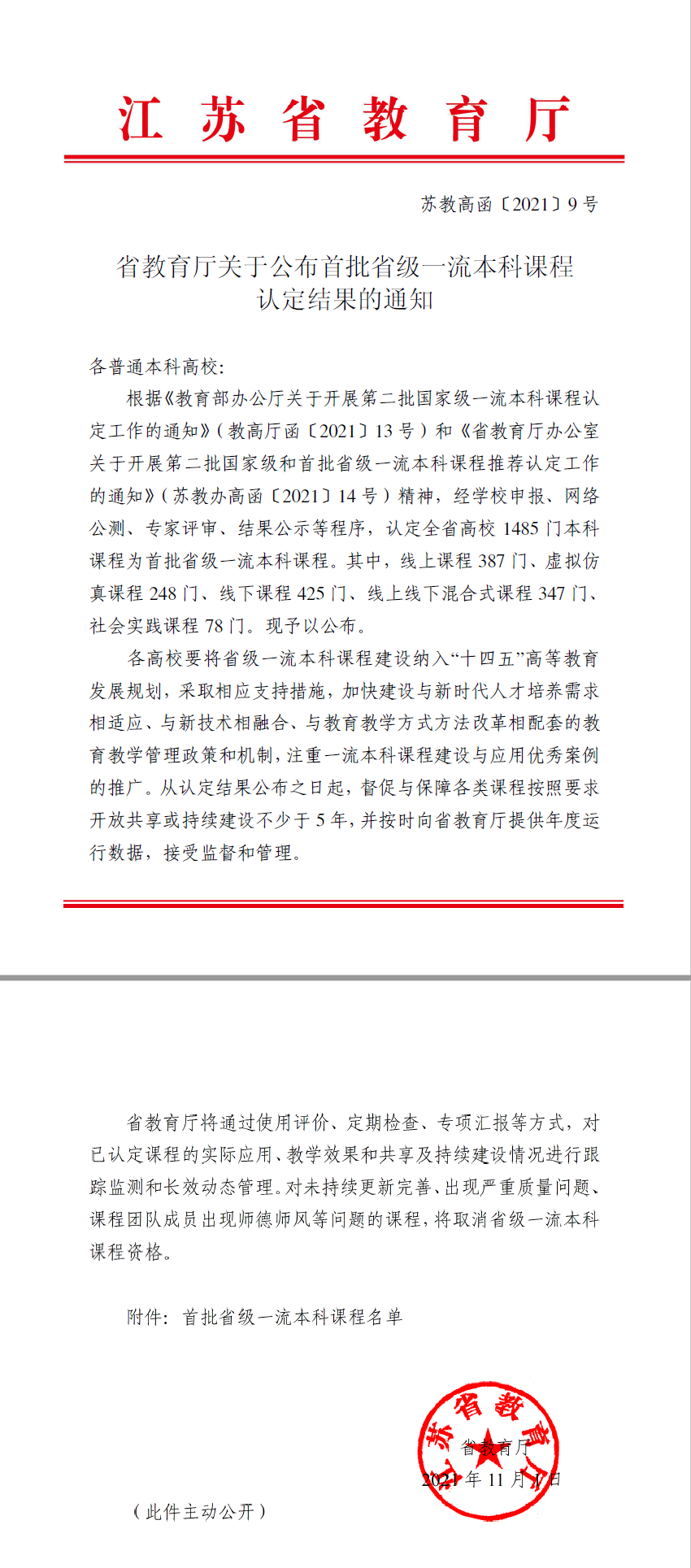 近日,江苏省教育厅公布了首批省级一流本科课程认定结果,JOJO漫画 4门课程被认定为省级一流课程,其中虚拟仿真课程3门,线下课程1门。