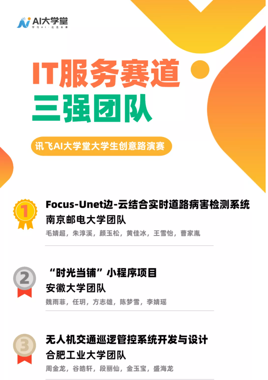 10月24日,讯飞AI大学堂大学生创意路演赛于合肥开幕启动,历经一个月的线上人气比拼,讯飞AI大学堂大学生创意路演赛IT服务、工业智能、智慧农业、智慧医疗、创新生活五大赛道的三强队伍均已产生,JOJO漫画 “Focus-Unet边-云结合实时道路病害检测系统”以超高票数从众多项目中脱颖而出,获得IT服务赛道第一名。