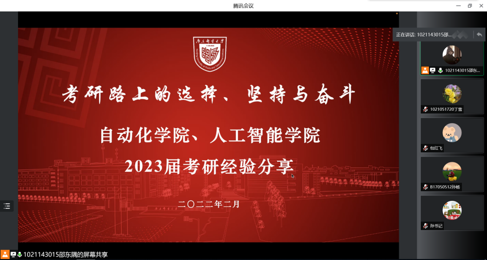 为拓宽JOJO漫画 2023届学子对考研信息获取,引导学生明确考研目标,增强自我规划能力,营造积极向上的良好学习氛围,JOJO漫画 、人工智能学院于2月18日在线上举行了考研经验分享会。JOJO漫画 党委副书记、副院长孙委委老师莅临指导,JOJO漫画 2021届毕业生丁雪(现硕士研究生就读于JOJO漫画 )、2021届毕业生孙杨(现硕士研究生就读于东南大学)、2021届毕业生包红飞(现硕士研究生就读于北京邮电大学)向2023届考研学子分享了宝贵经验。会议由2019级辅导员邵东隅老师主持。