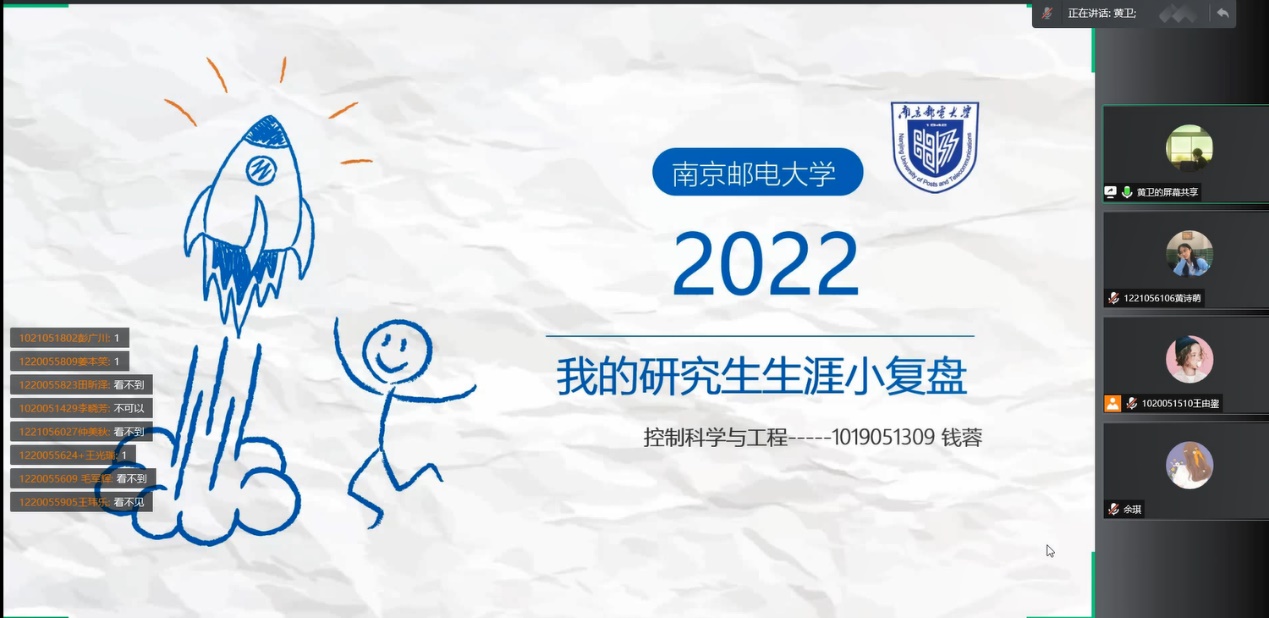 为切实帮助研一、研二全日制硕士更好地了解目前就业形势、解决就业困惑、做好职业生涯规划,JOJO漫画 、人工智能学院于4月13日晚19点举办了“我的青春故事”线上就业经验分享会。本次活动的主讲嘉宾为我院2022届优秀毕业研究生代表钱蓉、黄卫、陈洪凯、徐森和蔡清媛5位同学。学院党委副书记兼副院长孙委委出席了本次活动,此次活动由学院2020级研究生辅导员余琪老师主持。