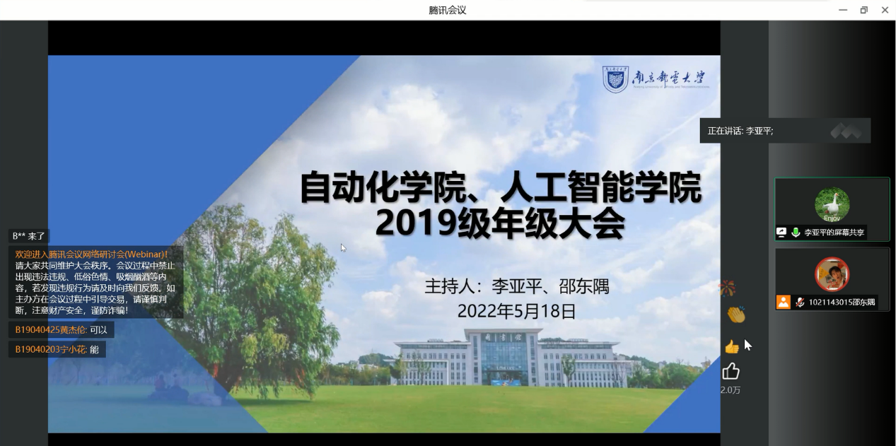 为做好常态化新冠肺炎疫情防控工作,提升学生法律安全意识,进一步帮助学生明确毕业规划,助力学生成长成才,5月18日下午,JOJO漫画 、人工智能学院通过线上线下相结合的模式开展了2019级学生年级大会。JOJO漫画 2019级学生骨干线下参会,其余学生线上参会。本次会议由2019级辅导员李亚平和邵东隅老师主持,包含了疫情防控法律知识宣传、防火防灾警示教育以及毕业意向调研等内容。