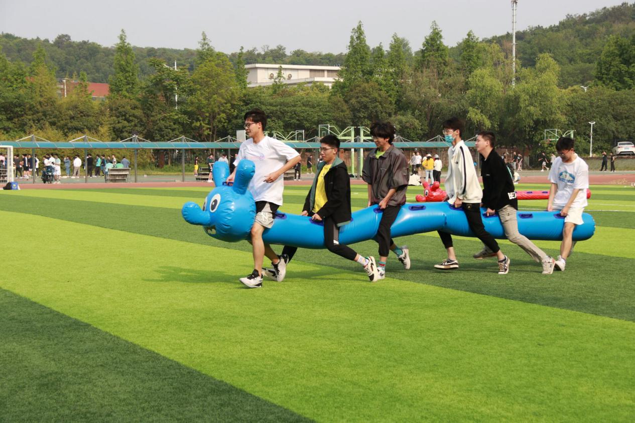 第二个游戏——毛毛虫竞速。团队成员骑在毛毛虫上,双手把住固定把手,立于起跑线后,裁判发令后,队员通过协调配合使充气毛毛虫在草坪上行进,赛程30米,往返一次,用时最短者为胜。同学们相互配合,虽然有成员跟不上队伍的脚步,不过他们重新快速站起来,调整策略继续比赛。赛场外,欢笑声、呐喊声不绝于耳,充分体现了“友谊第一,比赛第二”的体育精神。