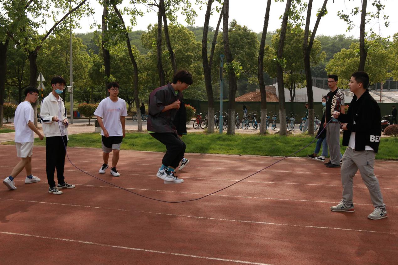 第三个游戏——跳长绳。两人摇绳,其余队员列队需从绳的一侧跳至另一侧,跳过的队员在同侧另一端排队,循环接替。跳绳队员依次进入且必须在进入后成功跳绳一次,方计次数一次。在比赛过程中,参赛选手们都打起了十二分的精神,狭路相逢勇者胜。有的队伍配合默契;有的队伍跌跌撞撞完成比赛,但没有一个队伍半途而废。大家相互合作,相互鼓励,富有节奏地跳动着。整场比赛精彩纷呈,展现了团结的力量,青春的活力。
