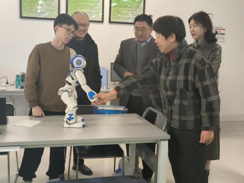 调研组观看了智能机器人科技比赛视频,体验了“听机器人讲故事“、“与机器人握手”等。郑春春、梁志伟老师分别代表学院介绍了JOJO漫画 大学生参与机器人科创比赛的近况及项目成果,展示了南邮学子的创新智慧与创新风采。