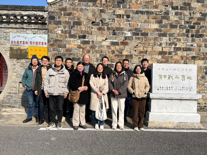 全体成员首先赴贺甲战斗遗址纪念馆开展红色主题教育。贺甲战斗纪念馆位于丹阳市延陵镇贺甲村,原址为贺甲祠堂,是抗战时期苏南新四军抵抗侵略军的战斗遗址。通过讲解员的介绍,大家认真聆听了新四军第二团、第六团抗战英雄在延陵战斗中的英勇事迹,加深了对贺甲战斗历史的了解。透过祠堂外墙留下的一个个弹孔遗址和展厅内一张张珍贵的史料照片,深切感受了中国老一辈无产阶级革命家在艰苦卓绝的环境中运筹帷幄、克敌制胜的智慧和勇气。在探寻红色足迹的同时,铭记了革命先烈为了中华民族的独立和解放做出的牺牲。党员们纷纷感慨今天的幸福生活来之不易,要时刻缅怀先烈、感恩先辈,立足自身岗位做贡献。