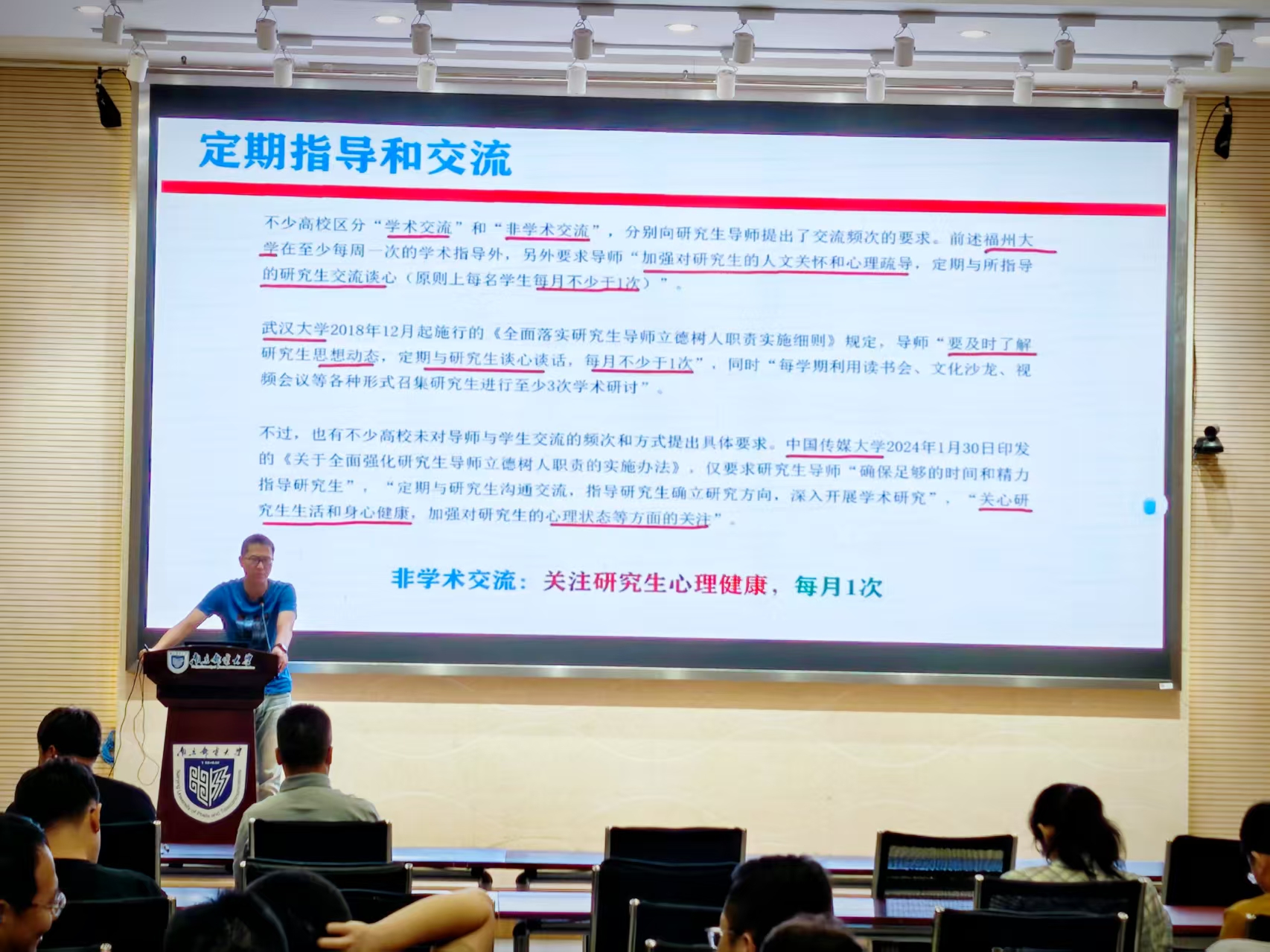 肖敏教授以《研究生培养中的问题思考》为题,从研究生培养的重要性出发,分享了选拔与指导研究生的宝贵经验。他指出,选拔研究生应注重其研究热情、抗压能力和积极心态。在培养过程中,需要通过定期指导、因材施教,加强团队建设,不断激发学生潜能。肖教授提出:“导师犹如玉匠,需慧眼识珠,也要用匠心去雕琢。”他还强调,导师要积极关注研究生心理健康,助力学生成长成才。
